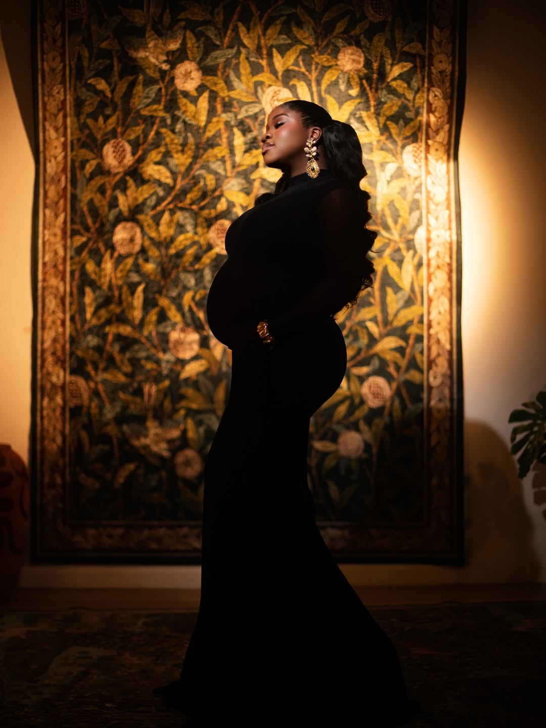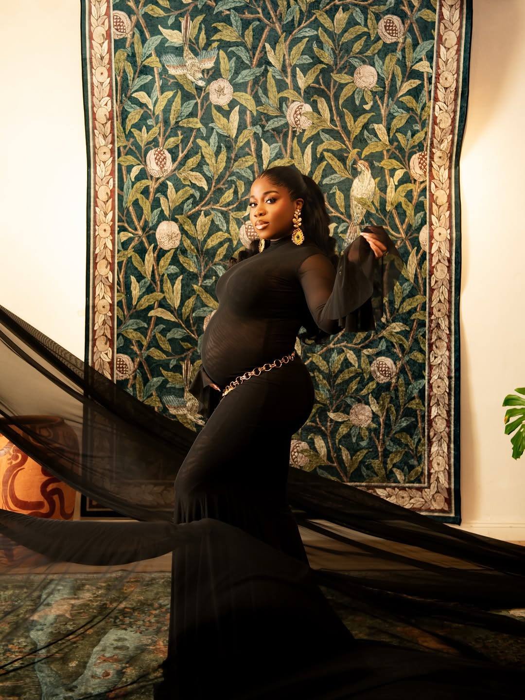 Veekee stepped out in a black sheer mesh gown that runs from a fitted turtleneck all the way down to a sculpted mermaid hem. The fabric hugs closely through the body, making her baby bump fully visible and intentionally part of the look.