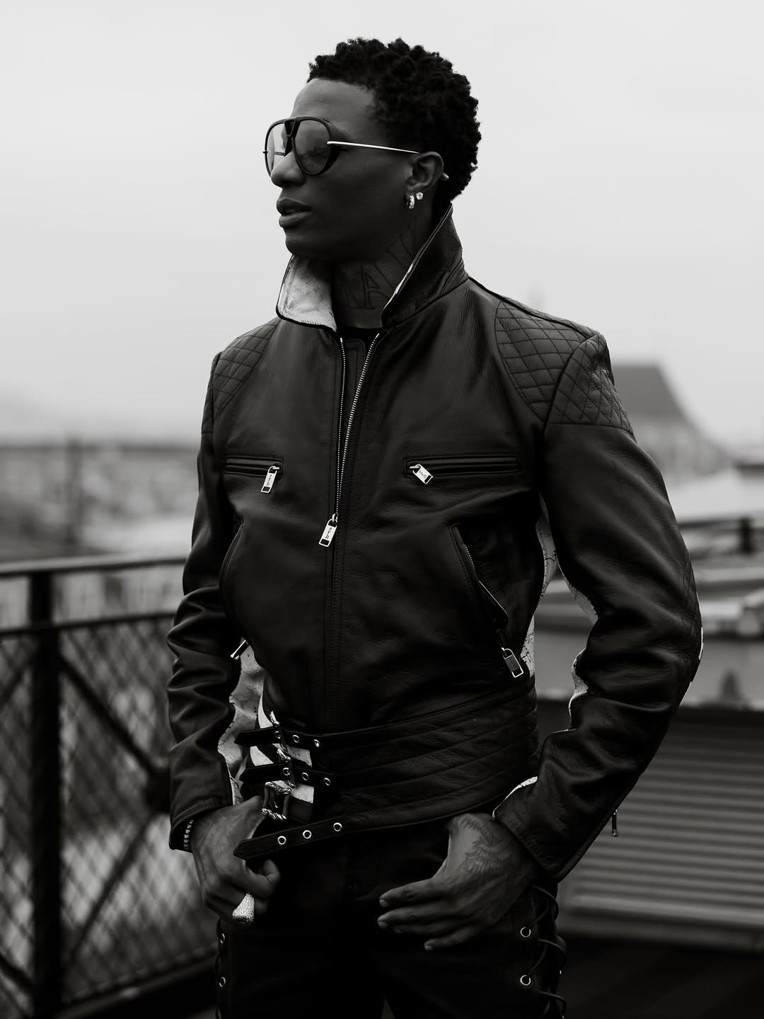 The entire series is shot in black and white, and the setting, a sleek modern space with floor-to-ceiling glass windows gives everything a cool, editorial quality that feels very deliberate. Wizkid goes for a full black leather look, head to toe. His jacket is a fitted biker-style piece with a contrast collar, and his trousers are the real talking point: lace-up detailing runs down the sides of both legs in a way that feels dramatic without being overdone. A double belt at the waist, pointed leather boots, a chain necklace, and dark tinted sunglasses finish the look. It is sharp and rock-influenced, and it works.