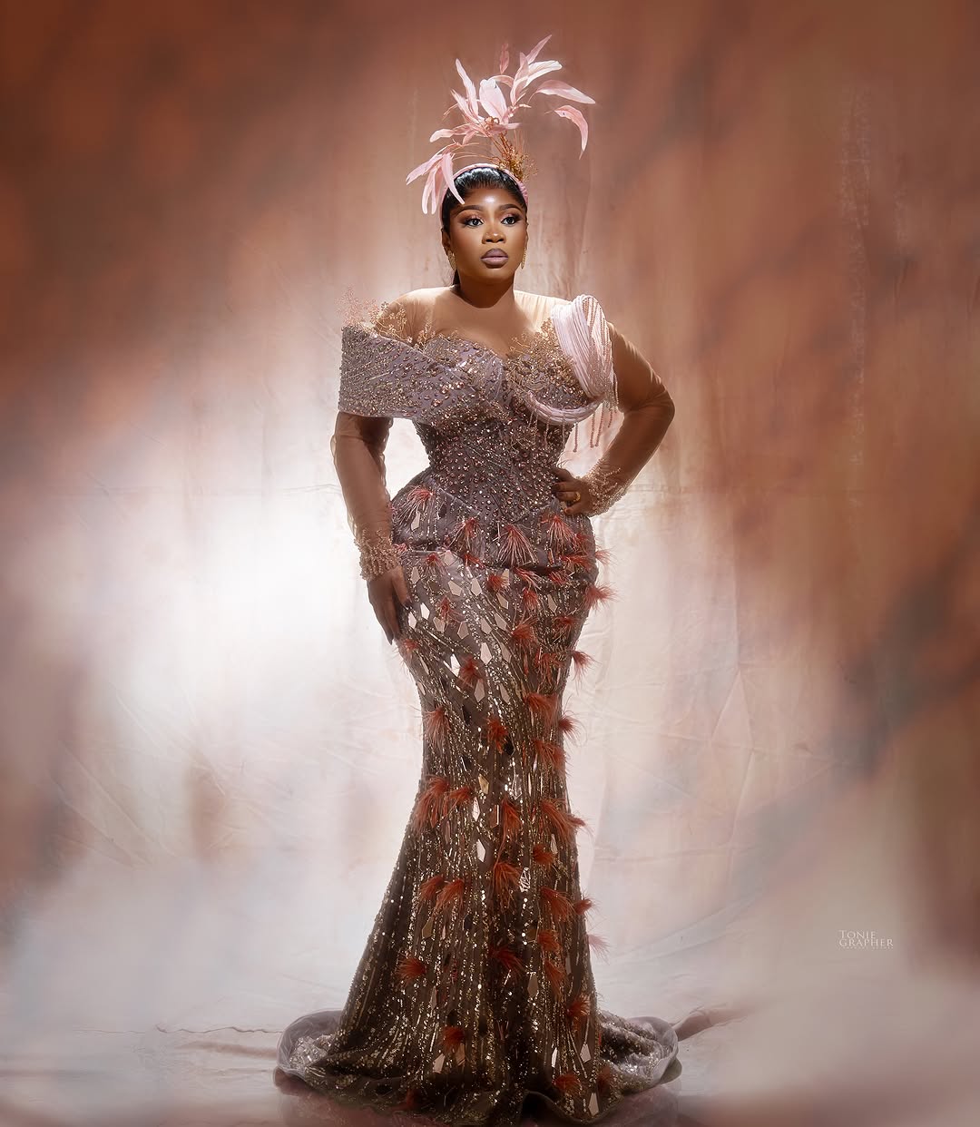 She wrapped the trilogy in rose gold — but not just any rose gold. This final look shimmered with beadwork and delicate feather embellishments that moved with every turn. If the first dress whispered “drama” and the second sang “youthful romance,” the last was a soft roar of glamour and power. It didn’t just close the show — it brought the curtain down.